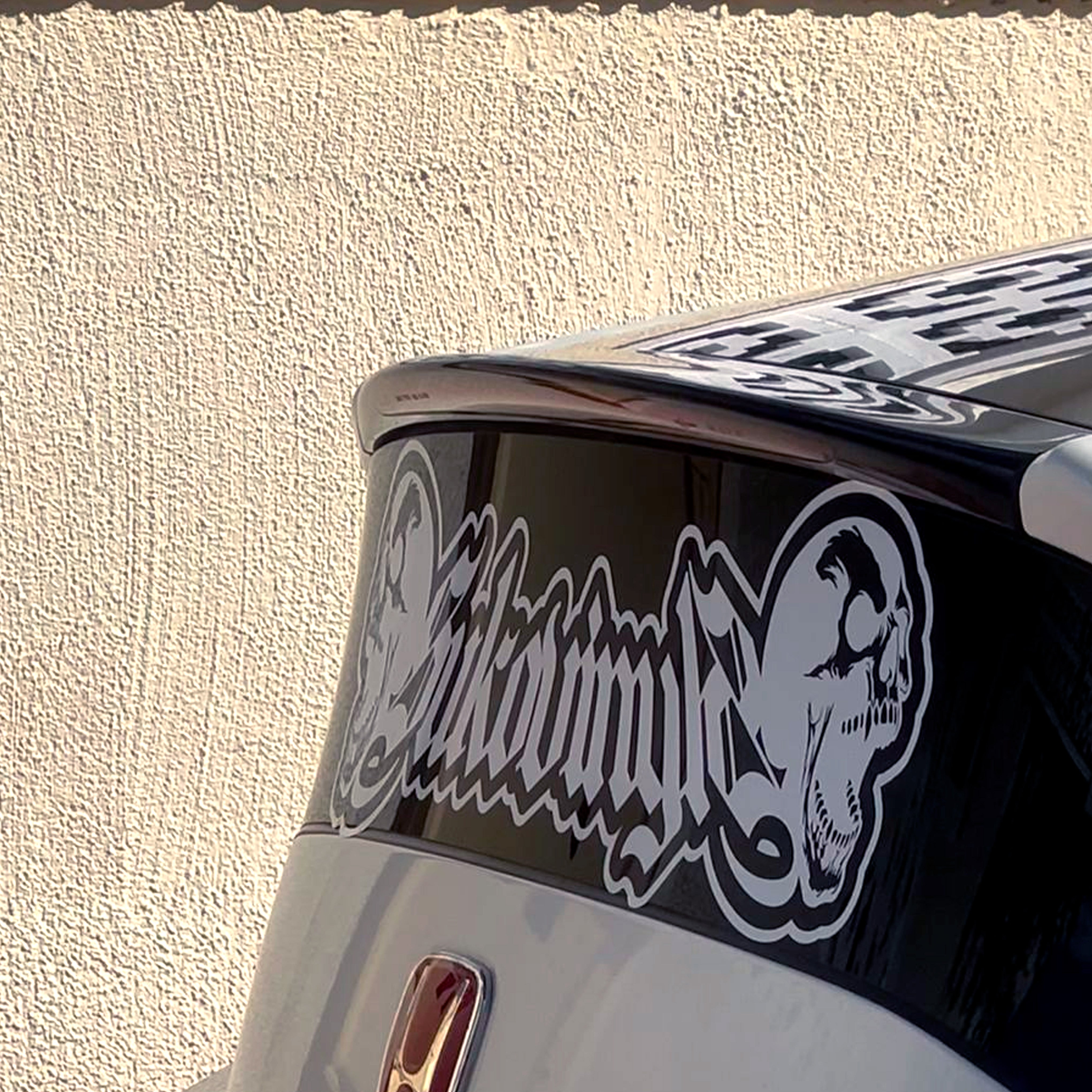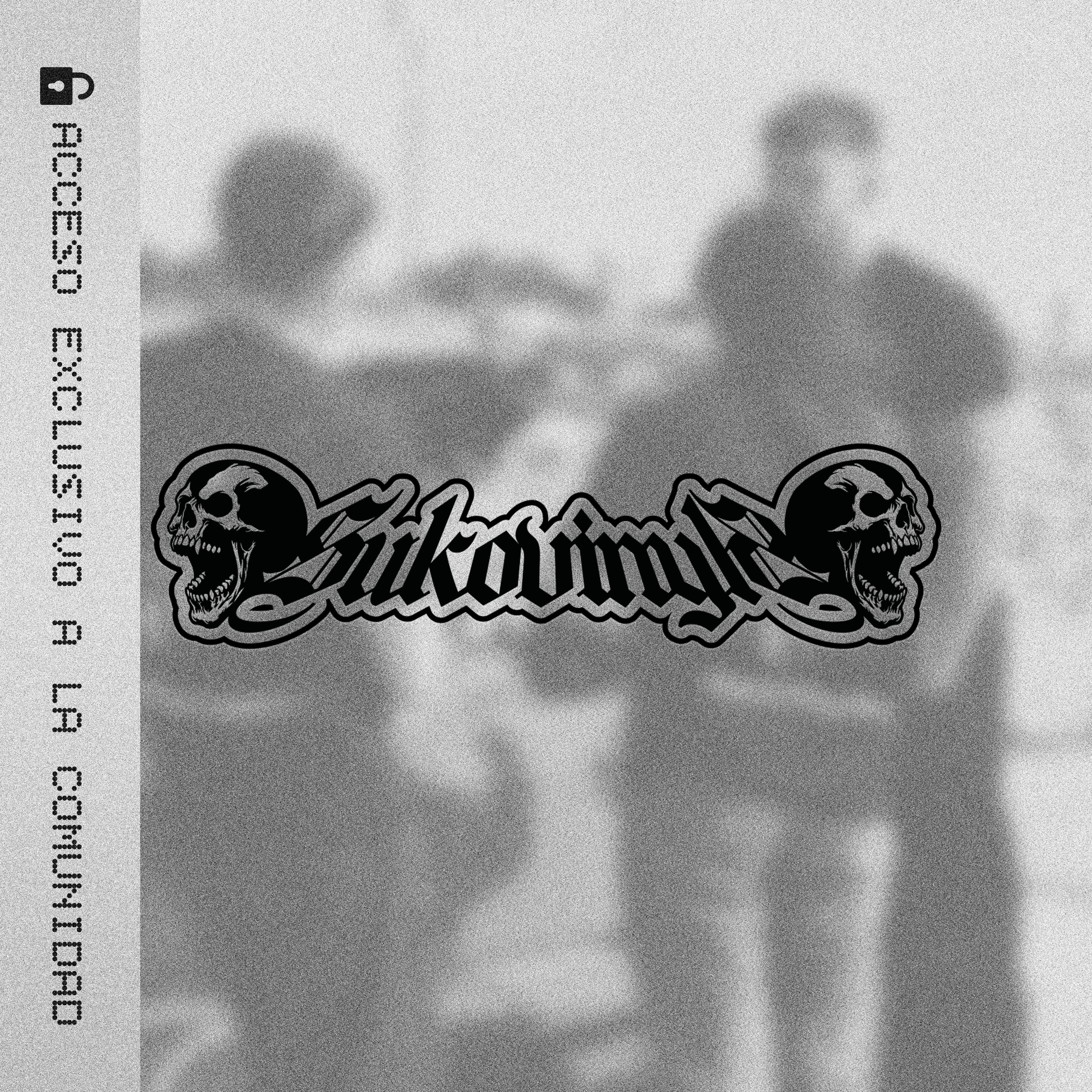 Un lettering gótico escoltado por dos calaveras agonizantes, simétrico, agresivo y llamativo, en formato banner.